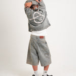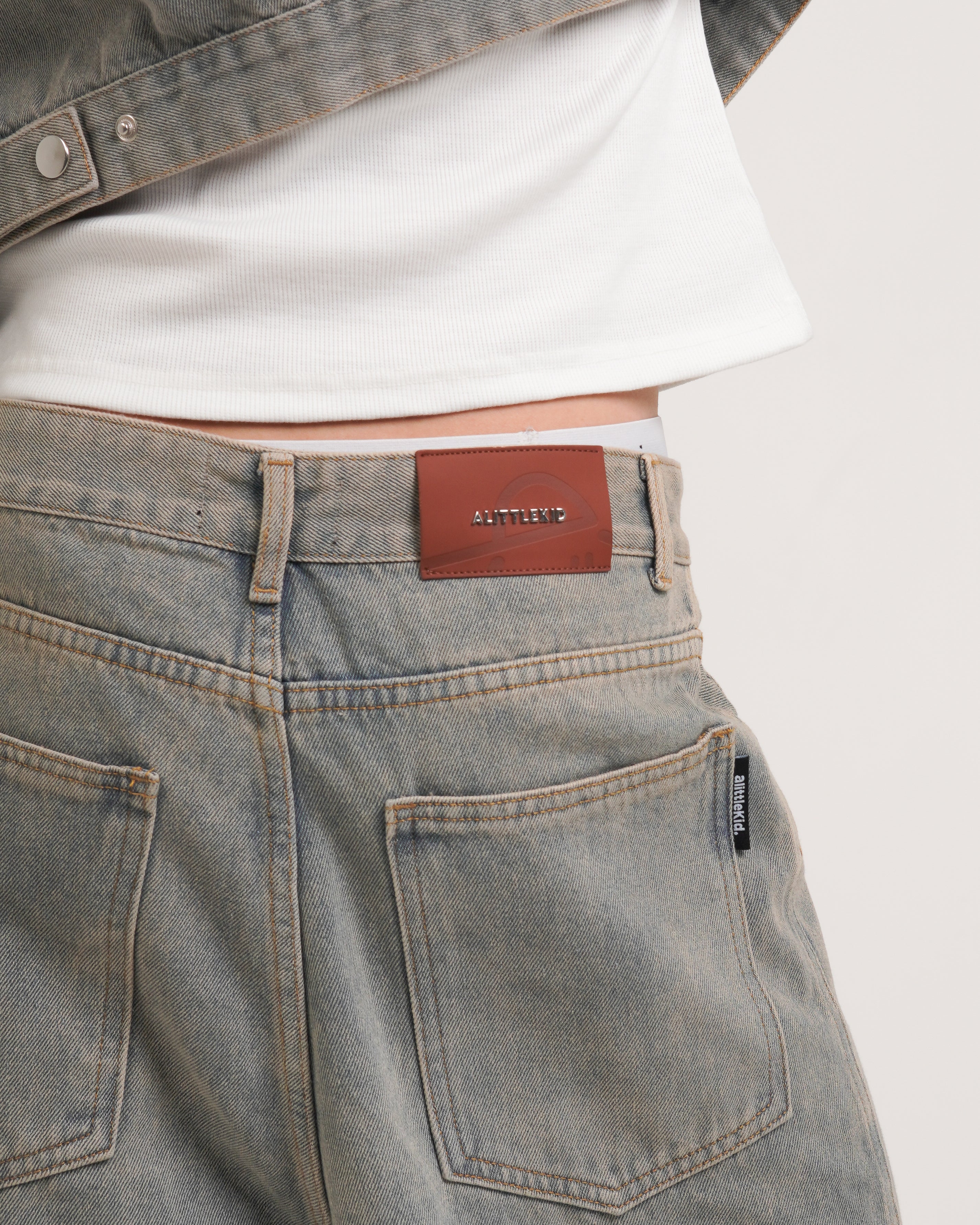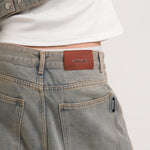 These wide-leg knee-length jeans are crafted from 14oz 100% cotton fabric, offering a sturdy and structured fit. Featuring a simple, versatile design, they include a small back pocket detail that adds a unique, stylish touch.